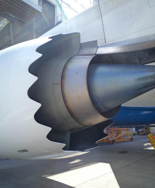 Mr Davis guesses this variegated engine trailing edge is to smooth the meeting of the high speed engine exhaust air with the static air and reduce noise.
