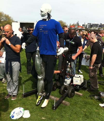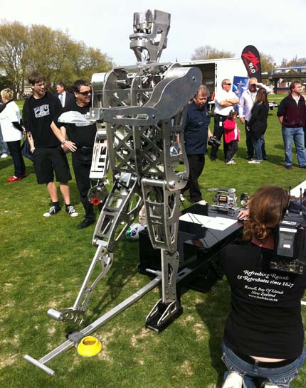 ABOVE: Massey University (Albany campus) robot "Dan", featuring a metallic, presumably more injury-resistant groin. While NBR was watching at least, it was the most consistent of the machines, landing several angled kicks. Officially it drew with Mehrtens, but if warm up and calibration kicks were included, the former All Black was way ahead.