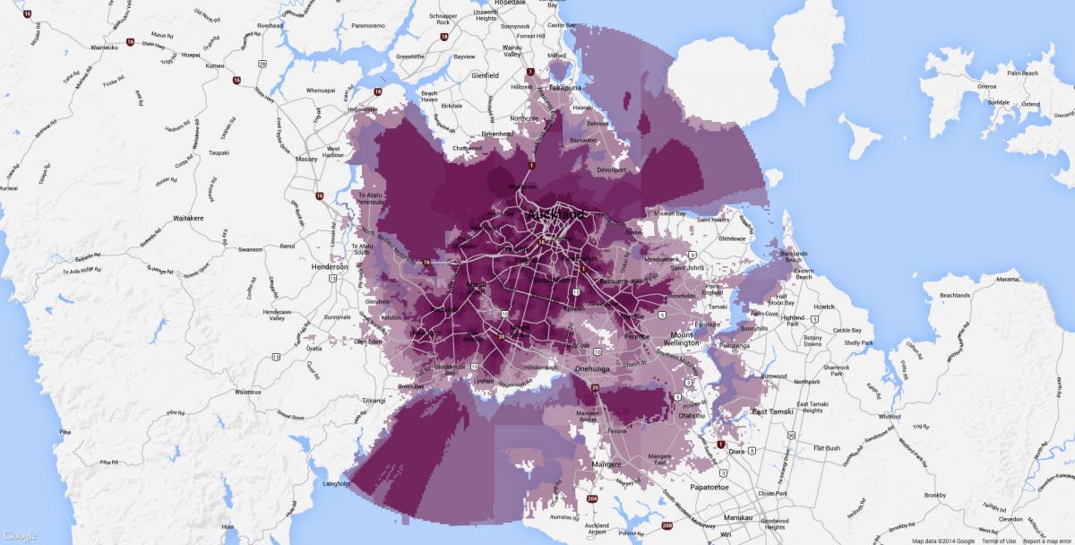 2degrees' 4G network coverage. The darker the purple, the stronger the coverage. Click to zoom (there's also an address checker on 2degrees' website here. Check out Vodafone's 4G coverage here; Telecom's here).