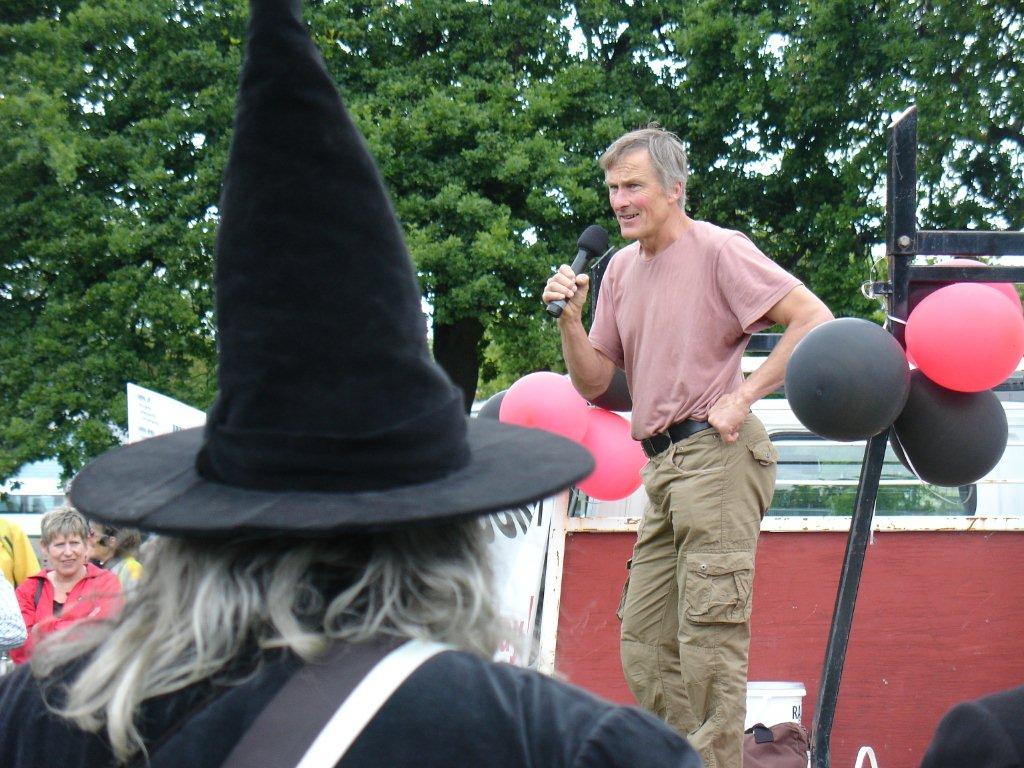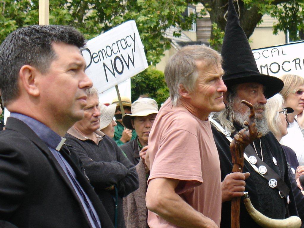 A recent city demonstration for democracy is fronted (from left) by the Rev Mike Coleman, sculptor, poet and Hurunui environmental activist Sam Mahon and the Wizard, who recently turned 80 and needs the staff for support