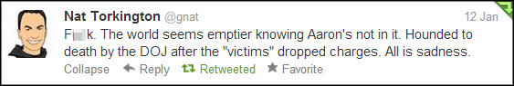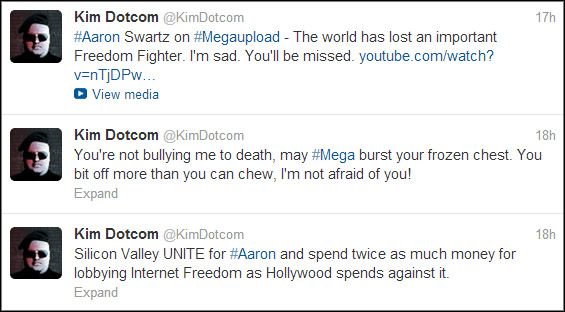 Kim Dotcom - which is launching his new file sharing service, Mega, on Sunday - also weighed in with several cutting tweets, several highlighting common cause with Swartz: