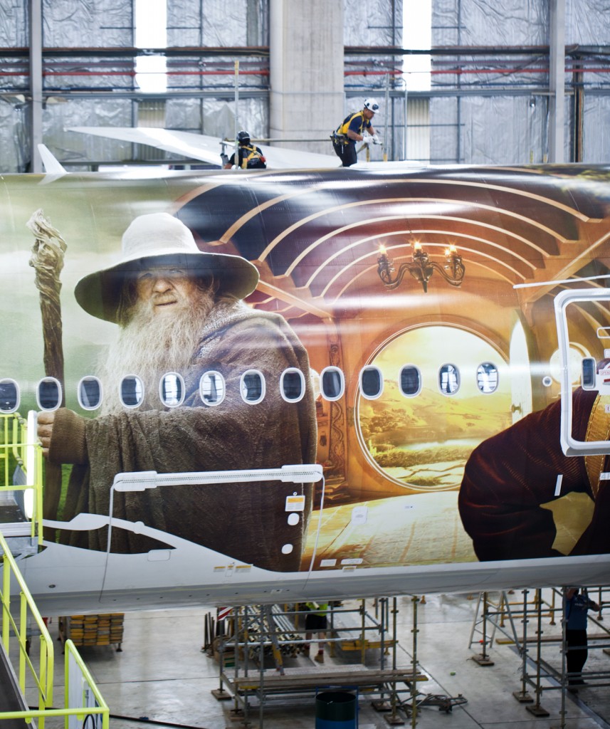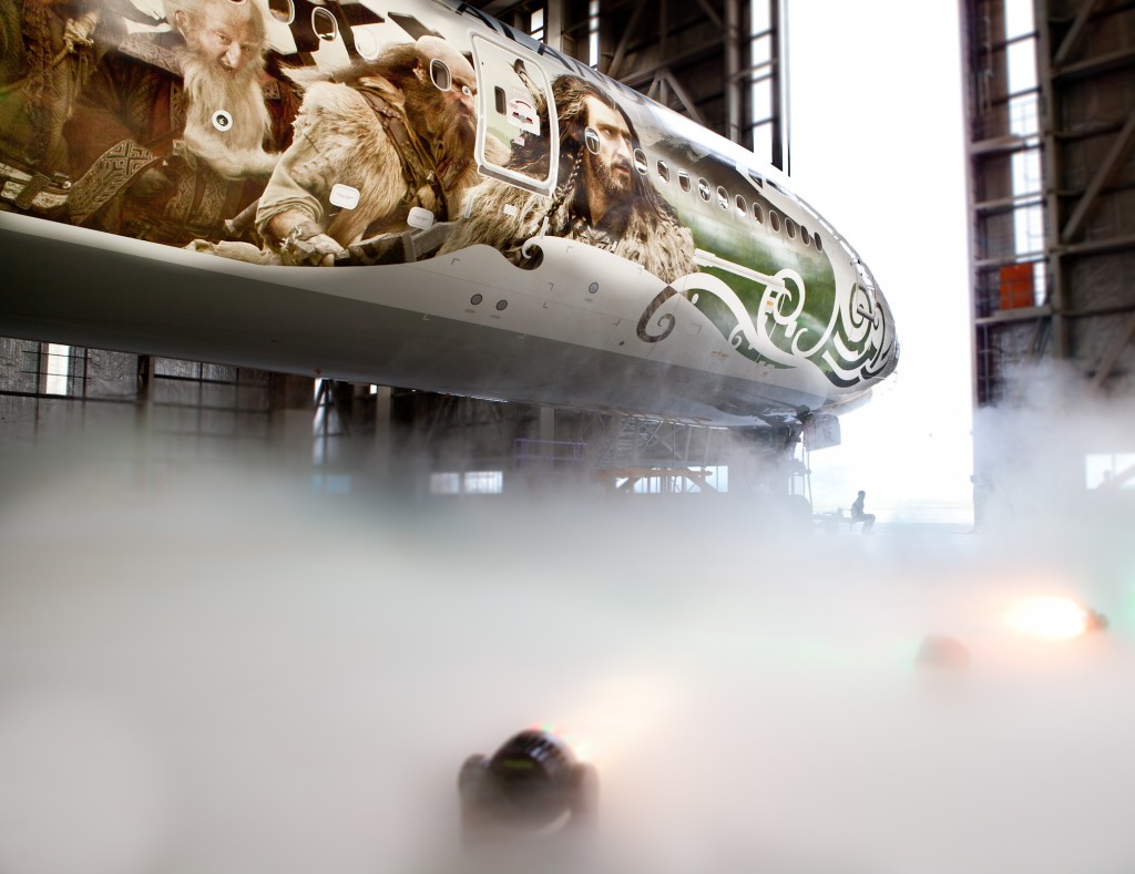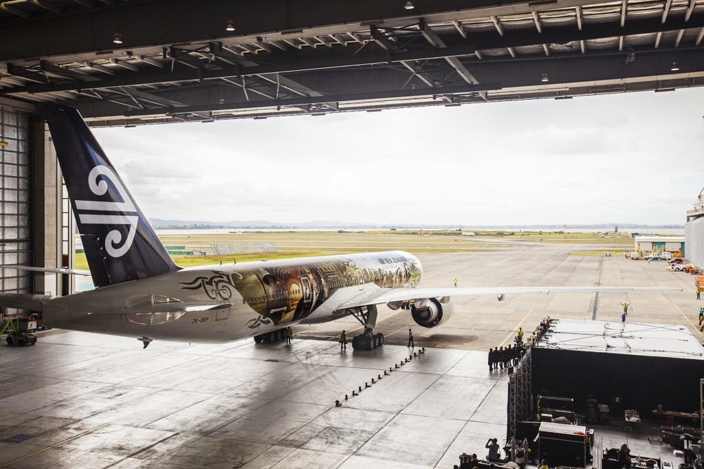 Ahead of The Hobbit's global premiere in Wellington this Wednesday, Air NZ unveils a plane decked out as a flying billboard. UPDATED with time-lapse video.