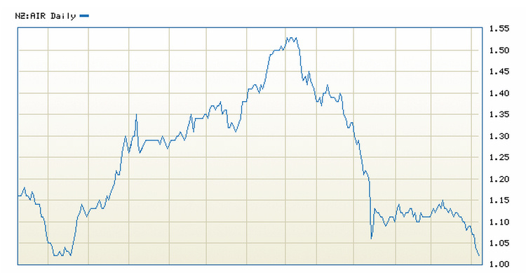 ABOVE: Air New Zealand shares (NZX: AIR) were down 1.92% to $1.04 yesterday, near the bottom of their 52-week range ($1.52 - $1.01). Click to zoom.