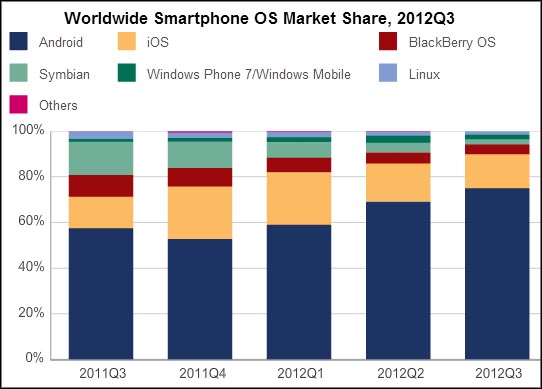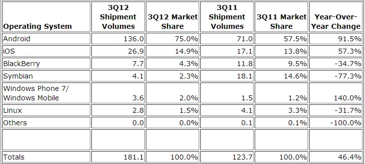 According to IDC's Worldwide Quarterly Mobile Phone Tracker, total Android smartphone shipments worldwide reached 136.0 million units, accounting for 75.0% of the 181.1 million smartphones shipped in 3Q12. The 91.5% year-over-year growth was nearly double the overall market growth rate of 46.4%.
