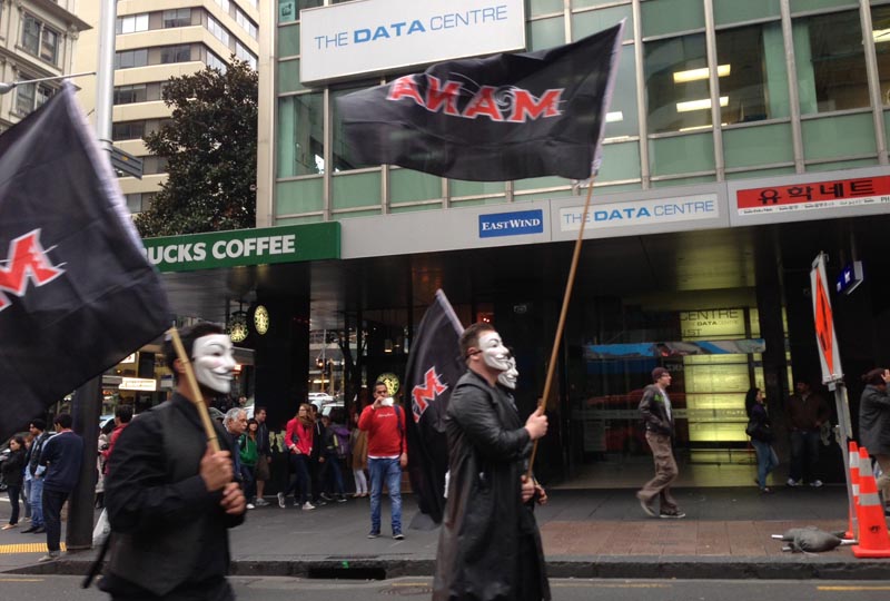 Protestors wearing Anonymous' signature V for Vendetta masks during an anti GCSB Bill march up Auckland's Queen St on Saturday. They numbered three of around 2000 (Chris Keall).