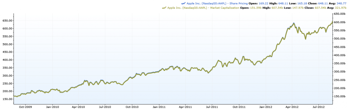 Apple three-year share performance/market cap (source: S&P Capital IQ; click to zoom).