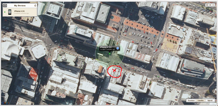 ABOVE (click screen shot to zoom): "Find My Phone", a feature formerly only available as part of the $120/year Mobile Me service, is free with iCloud, accessed via iCloud.com. I used it three times while at NBR Towers, aka Achillies House in downtown Auckland (the red X above shows my approximte corner location, with my iPhone 4 on my desk). I had three goes locating my iPhone 4, which only takes seconds via iCloud (like all high-end smartphones and tablets, the iPhone 4 has assisted GPS, aka a-GPS, which combines satellite and cellular systems to pinpoint a handset's location. One was bang on. Another (see screen above, click to enlarge) had me diagonally across the screen, another two blocks south. GPS signals can bounce off buildings and other obstructions, sometimes delivering slightly inaccurate results. If you're looking for your iPhone, iPod Touch or iPad in an open space, Find My Phone could be a big help. But if you think you've tracked your phone to a particular dwelling, you could be wrong, so think twice before throwing a punch.