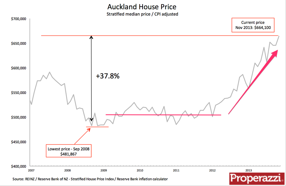 Back in November 2008 the Stratified median price in Auckland as measured by the Real Estate Institute was $435,700.