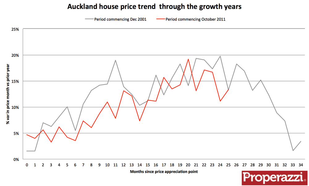 The chart below tracks the first 36 months of the property rises from December 2001 as measured as year on year growth and then tracks the 26 months of the 2011 to date run. An similarity of price growth trend - but very likely to tail off in the next 12 months.