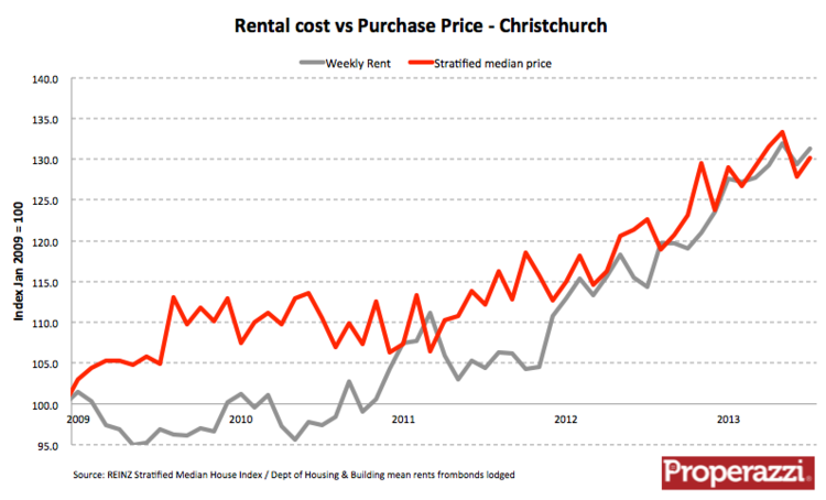 If Auckland really had a housing crisis then rents would be increasing - it's the same economics of supply and demand. To look for proof, look at the same chart for Christchurch below. The fact is that Christchurch has a real housing crisis. There are too few available properties to meet demand as a consequence of the earthquake and the subsequent rebuild programme. In that market both rents and prices are rising, almost in alignment: