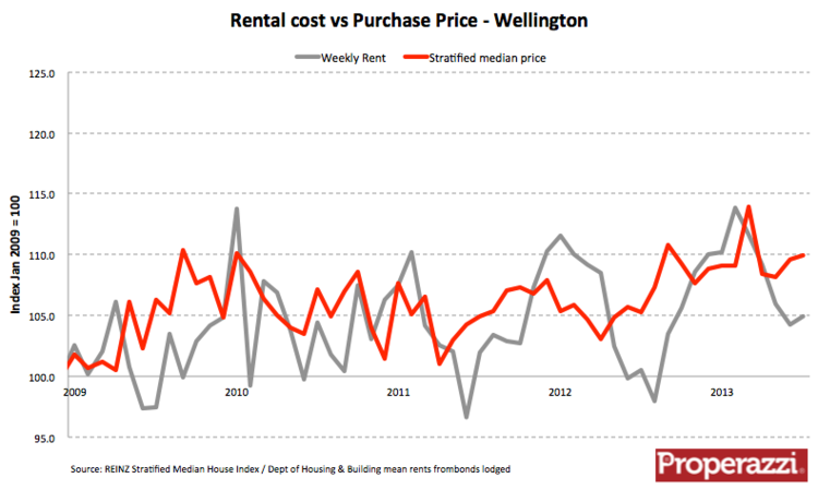 Now look at Wellington, a market that is not suffering a shortage of property and we see an alignment of rental price appreciation to property sale price appreciation.: