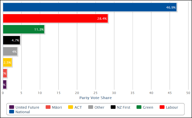 UPDATE Nov 16: NZ First's projected share of the party vote jumped from 4.6% to 4.9% in the iPredict political marketplace last night.