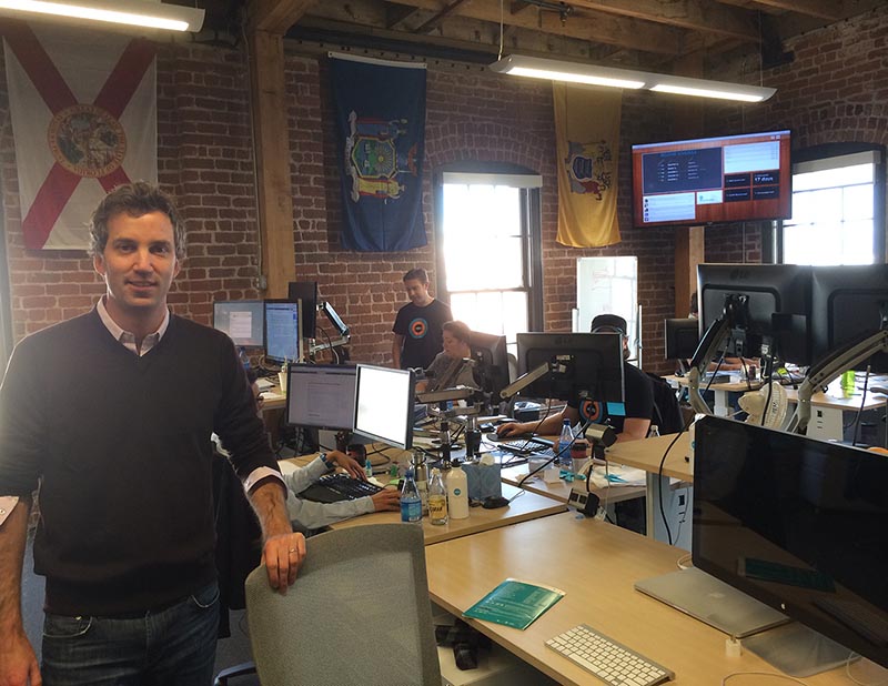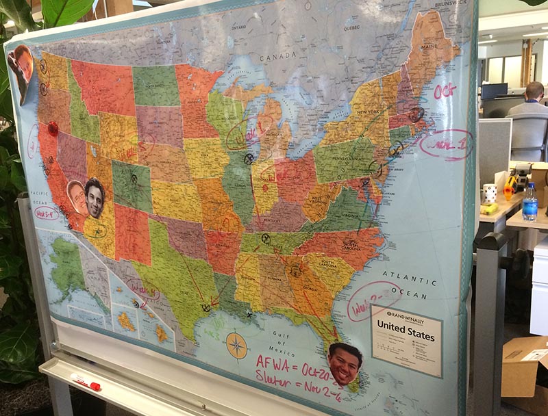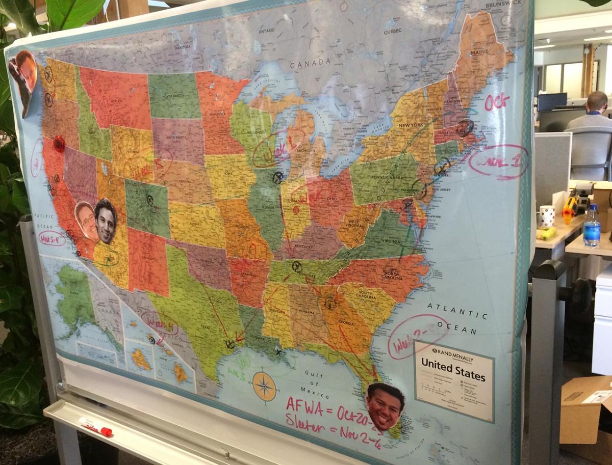 ABOVE: Sutherland with members of the Xero's US payroll team. The Xero president says with different laws and regulations, with each state it's like developing a payroll system for another country. A state flag goes on the wall as payroll for each state is completed.