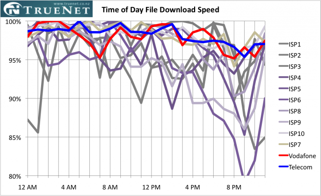"Snap was almost as good, maintaining 94% after last month being on a par with Telecom. The worst performers are far behind with one ISP showing the average speed slowing to less than 80% of its peak speed, suggesting severe congestion."