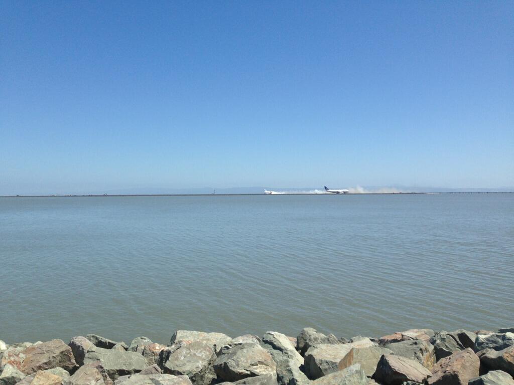 Another tweeter, Stefanie Laine (@stefanielaine) took a long distance photo of the crash as it happened. The photo was taken from her hotel across the water. She tweeted the planed seemed to "Came in at a bad angle, flipped, rolled, broke apart."