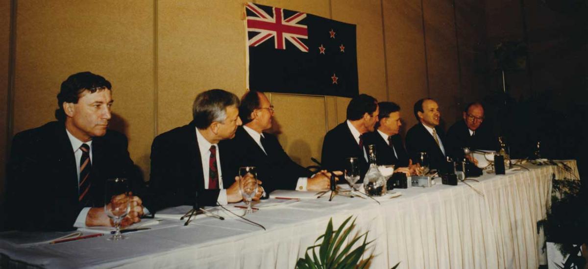Announcing the sale of Telecom for $4.25 billion (an inflation-adjusted $7.10 billion) in 1989. From left: Gibbs, David Richwhite, Richard Prebble, David Caygil, Peter Shirtcliffe and representatives from US shareholders Bell Atlantic (now part of AT&T) and Ameritech (now Verizon). [Today - Dec 20, 2012 - Telecom and the spun-off Chorus are worth a combined $6.11 billion. the privatisation is now being reversed, at least to a degree. Through Crown Fibre Holdings, the current government is in the process of investing $929 million in Chorus via the purchase of shares and an interest-free loan. - CK]