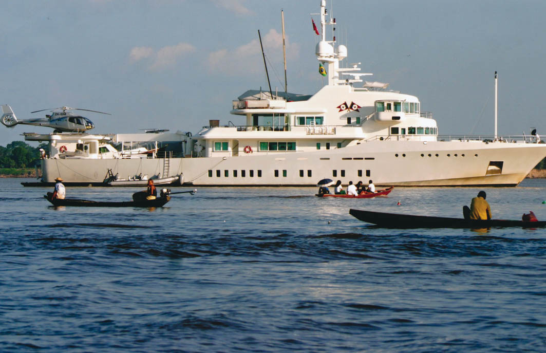 While Gibbs was back in London wrestling with the next stage of the amphibian project, Senses was taken hundreds of miles up the Amazon River to Manaus, a city of more than a million people in the middle of the jungle. Since they were thought to be amongst the first foreign private cruisers up the river since the murder of the New Zealand yachtsman Sir Peter Blake outside the violent river town of Macapa at the end of 2001, they’d taken the precaution of having an armed Ghurkha on board. Gibbs arrived in August 2005, and they prepared to travel up the Negro and Solimoes arms of the great river system upstream from Manaus. The Negro runs black but clear, like tea, while the Solimoes flows brown and muddy. When the two rivers meet at Manaus the currents and eddies produce elegant black and brown swirls that from the helicopter looked like works of art.