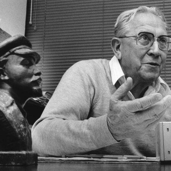 Bill Andersen, watched by Lenin, explains his resignation from the SUP in 1990. Photo: NZME.