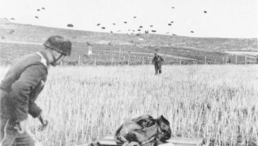 German Fallschirmjäger (paratroopers) landing on Crete, May 1941.