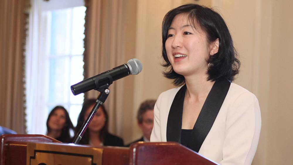 Eva Dou speaking at the Overseas Press Club of America in 2019.