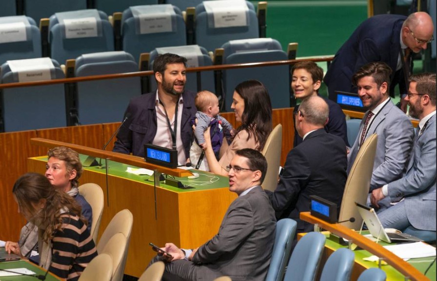 Clarke Gayford, Jacinda Ardern, and baby Neve at the United Nations.