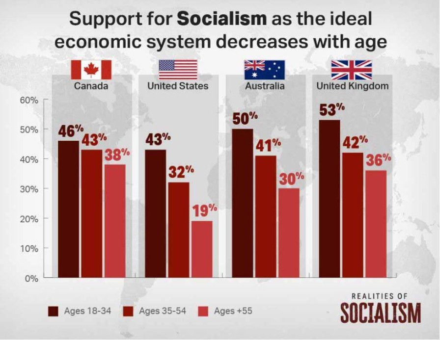 Socialism remains the economic system of choice for people under 34 in the four main Anglophone countries, of which New Zealand is also a part.