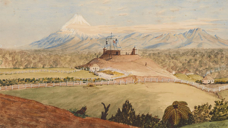 Henry Rawson’s watercolour of the Omata stockade in New Plymouth, 1864.
