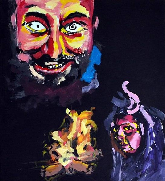 Fabio Merizzi’s painting depicting the Master and Margarita in the act of burning the manuscript (2020).