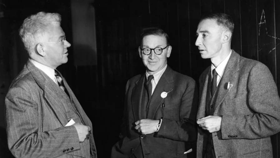 From left: Mark Oliphant, British scientist John Cockcroft, J Robert Oppenheimer. 1948. Photo: University of Adelaide.