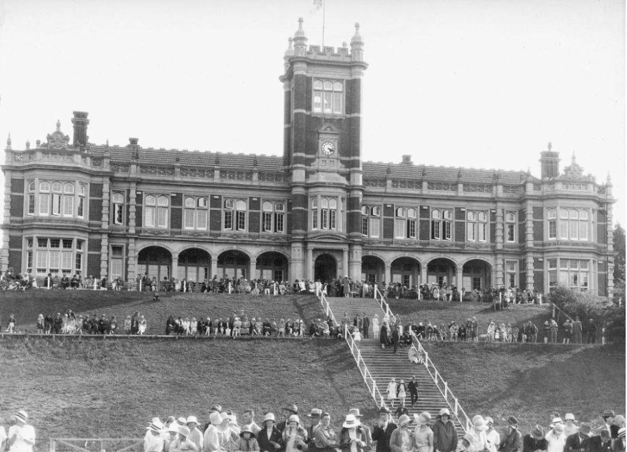 Nelson College sports day in 1920. The original wooden building, which Rutherford attended from 1887-89, was destroyed by fire in 1904.