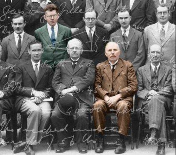 Cavendish Laboratory staff picture in 1932. Oliphant and Rutherford are highlighted in colour. Detail from alternative cover for Andrew Ramsey’s ‘The Basis of Everything’.