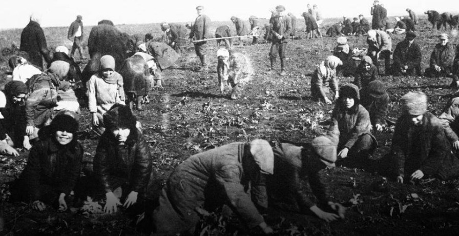 Children collect frozen potatoes during the famine in 1932-33.