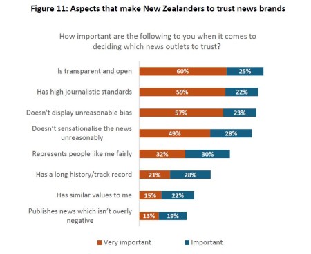To better understand aspects of news trust, the Jmad research introduced some new questions this year, including asking New Zealanders what aspects were important for them in terms of trusting a specific news brand. About 85% of people said they trusted a news brand that was transparent and open; 81% trusted a news outlet that had high journalistic standards; and 80% trusted a brand that was not “unreasonably biased”.