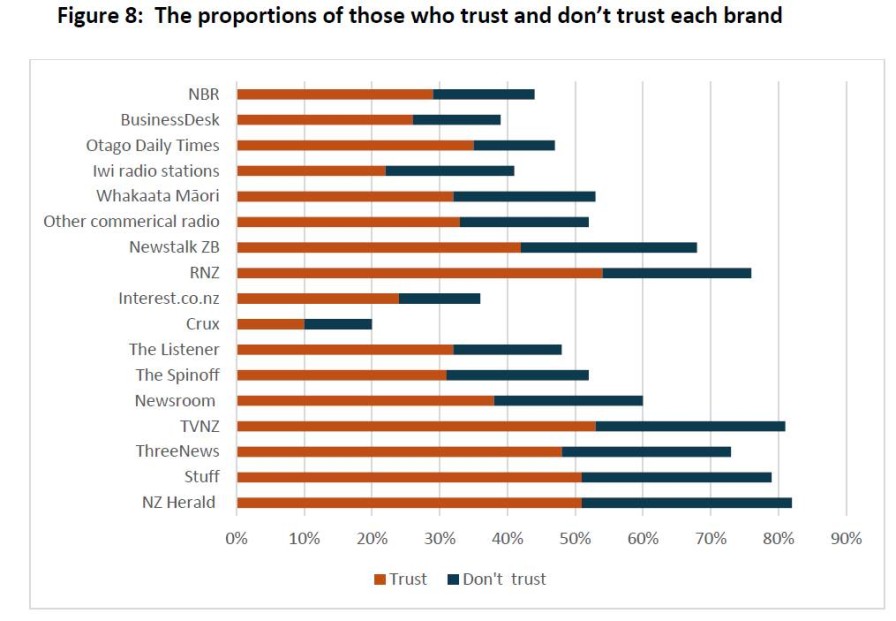This compares with last year, when the Otago Daily Times was perceived as the most trusted brand, followed by NBR and RNZ at second-equal, and TVNZ, Newsroom, other commercial radio stations and BusinessDesk jointly ranked as the third-most trusted brands.