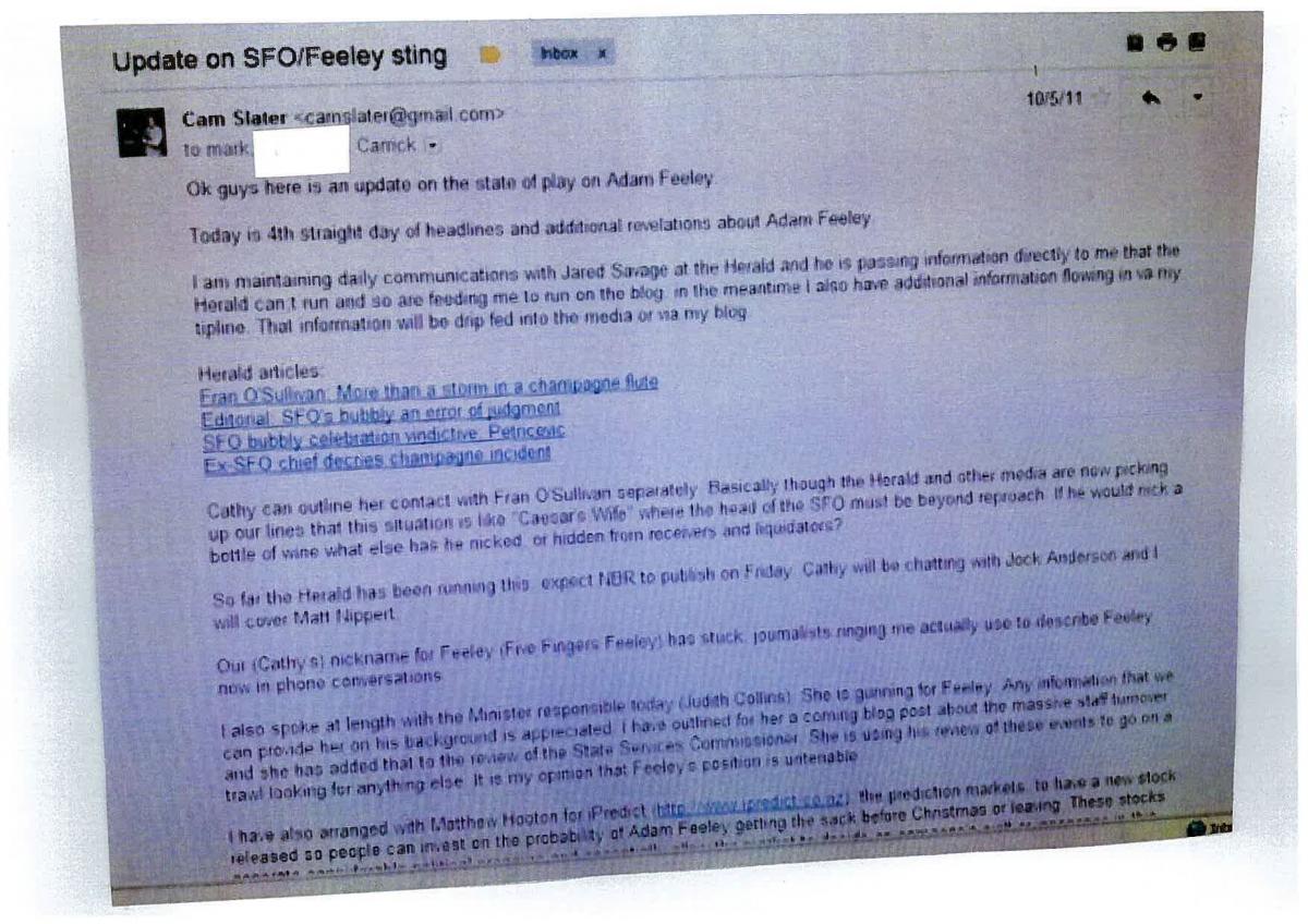 The email details how information being leaked to media by Mr Slater and others, and references a story by then NBR chief reporter Jock Anderson about Mr Feeley and his staff toasting charges against Bridgecorp's directors with an expensive bottle of champagne seized in an earlier raid on the failed finance company. The story was based on an interview with the head of the Criminal Bar Association, who called for Mr Feeley to stand down over the incident (the SFO head was ultimately let off with a caution after a State Services Commission investigation. He resigned 10 months later — three years into his five-year term — for a local body role in Queenstown).
