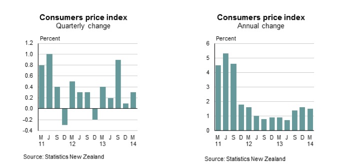 The consumers price index rose 0.3 percent in the three months ended March 31, accelerating from a quarterly rate of 0.1 percent in the fourth quarter of 2013, according to Statistics New Zealand. That was slower than the 0.5 percent pace predicted by the Reserve Bank and economists. The annual pace of inflation slowed to 1.5 percent from 1.6 percent in calendar 2013, also below expectations.