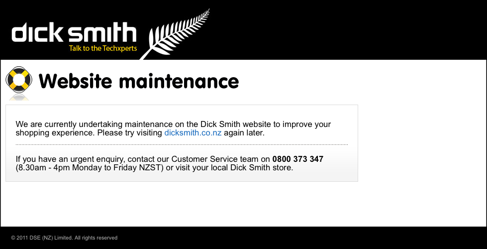 At time of writing the normal New Zealand website was still offline, with a “Website maintenance” placeholder up. The Australian website was unaffected.