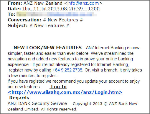 "The use of NZ phone numbers is not unusual. It may simply be an IP phone number that diverts, or it could even be a legitimate phone number of the ANZ. It doesn't matter. They even handily advise you to to go to the branch and set up Internet Banking. They're just looking for the percentage of people who might enter their bank login details."