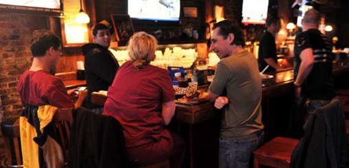 About 30 people, many of them police officers, camped out around the two long bars with beers and large plates of chicken wings and other comfort food.