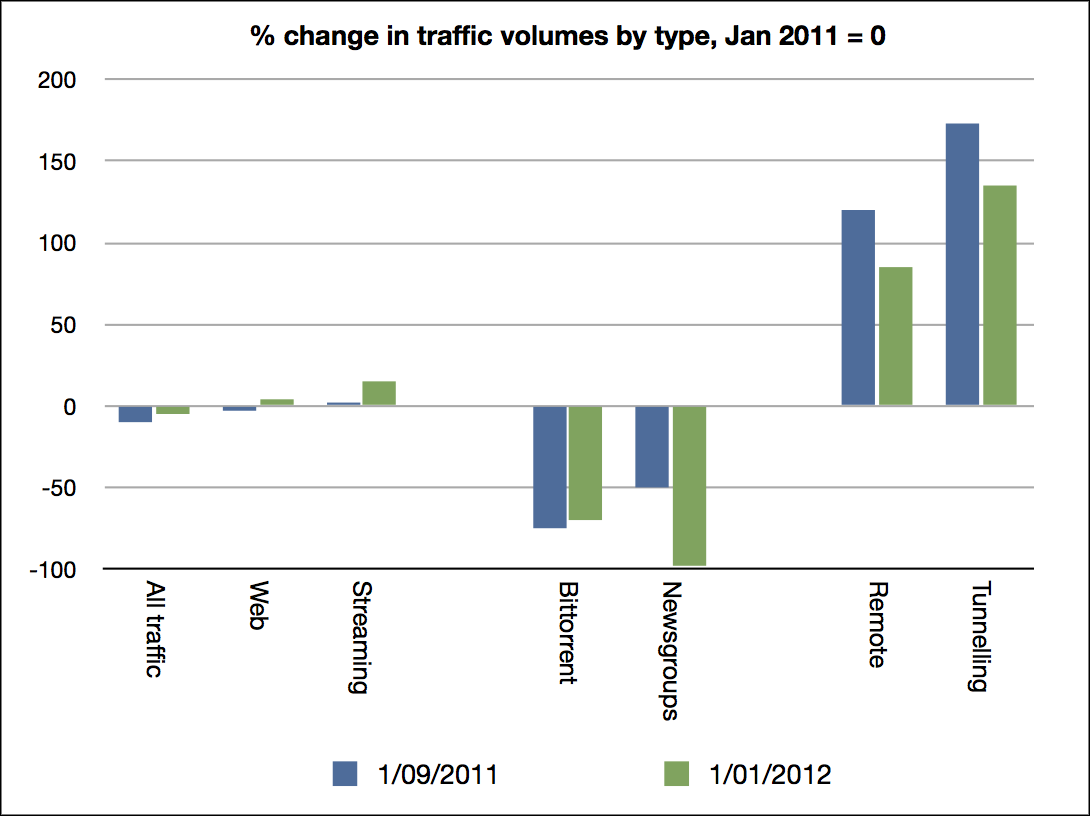 We also see that, immediately following the law coming info force on 1 September 2011, there was a 75% reduction in measured peer-to-peer traffic, and this was sustained into January this year. Newsgroup traffic (a large source of file sharing) has dropped to almost zero!