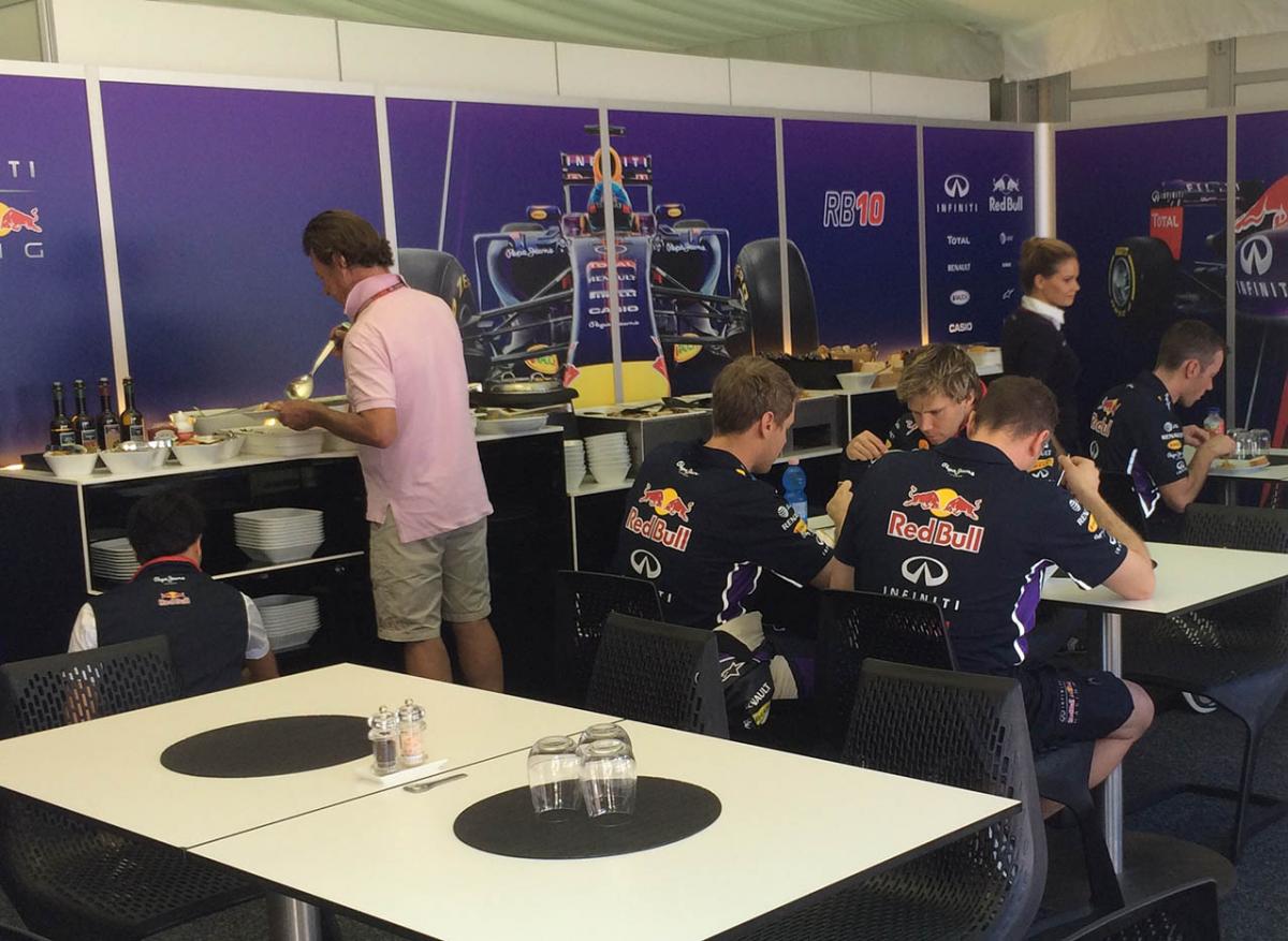 An EXCLUSIVE! photo of Sebastian Vettel (left, seated) eating lunch. Yes, he does quaff his sponsor's product.