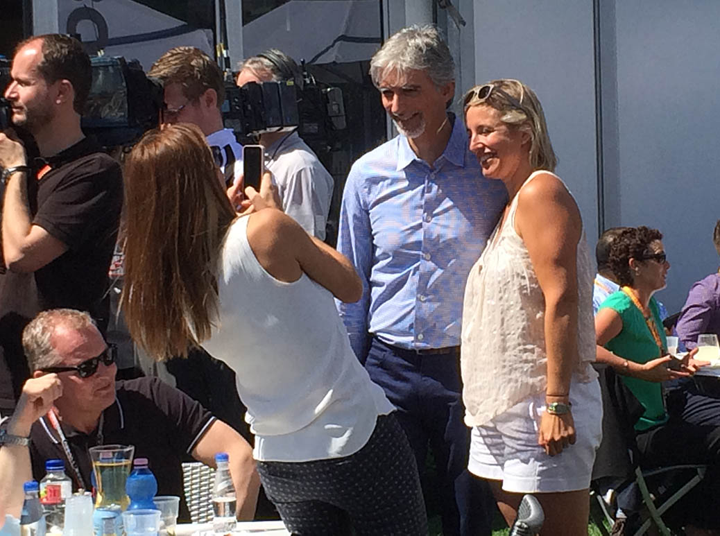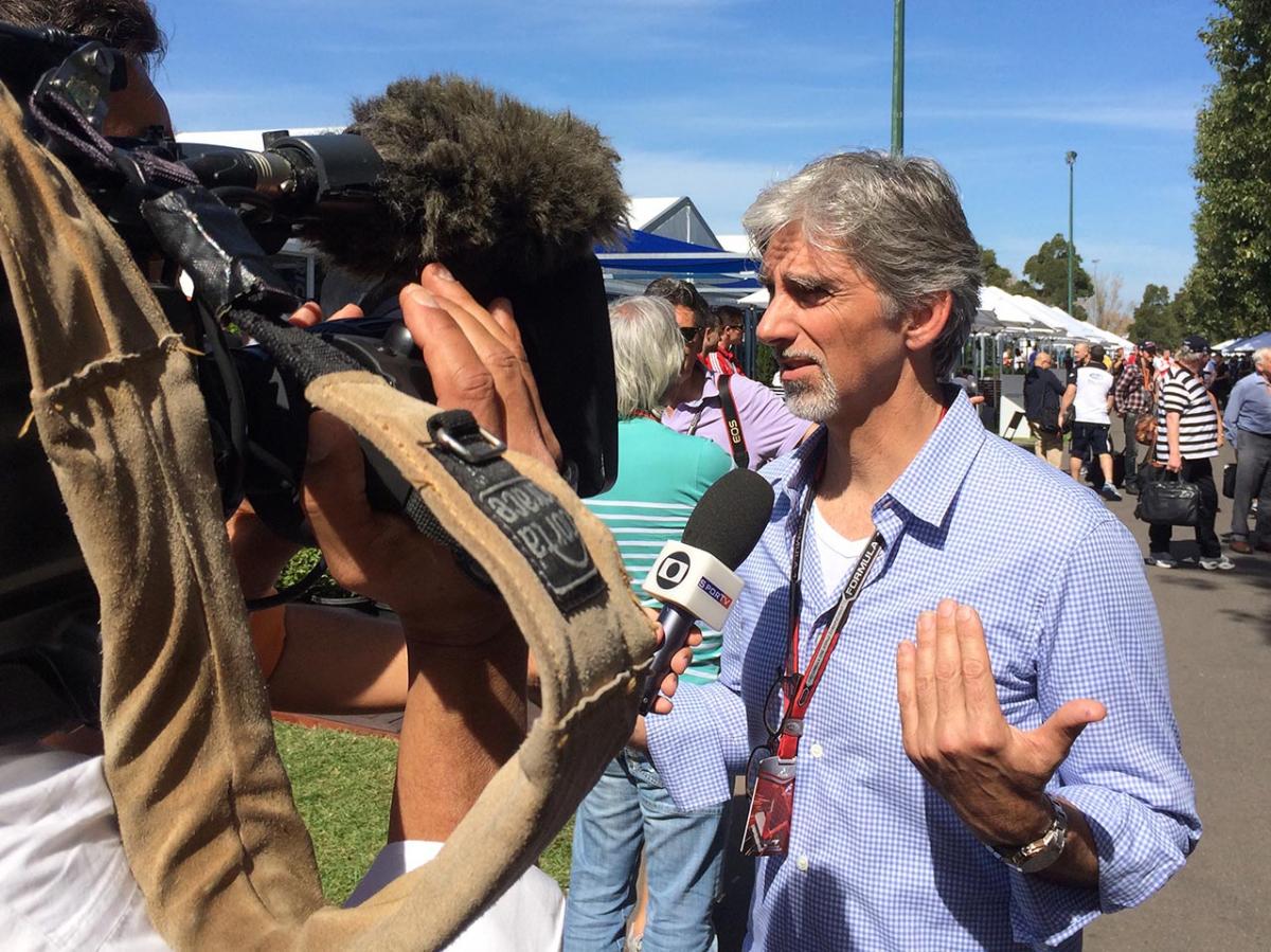 Ex-driver Damon Hill works the lane - with a few interviews, celeb selfies, and a bit of white-anting of Infiniti Red Bull Racing.
