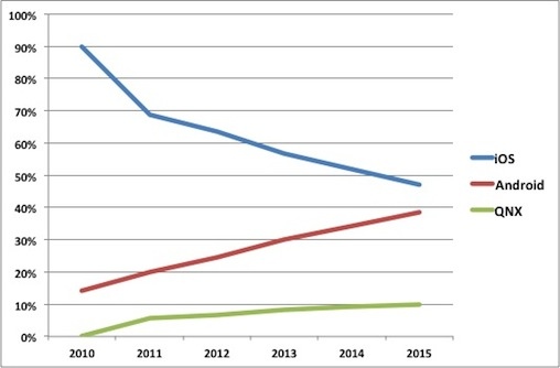 iOS - Apple iOS; Android = Google Android; QNX = RIM BlackBerry PlayBook OS