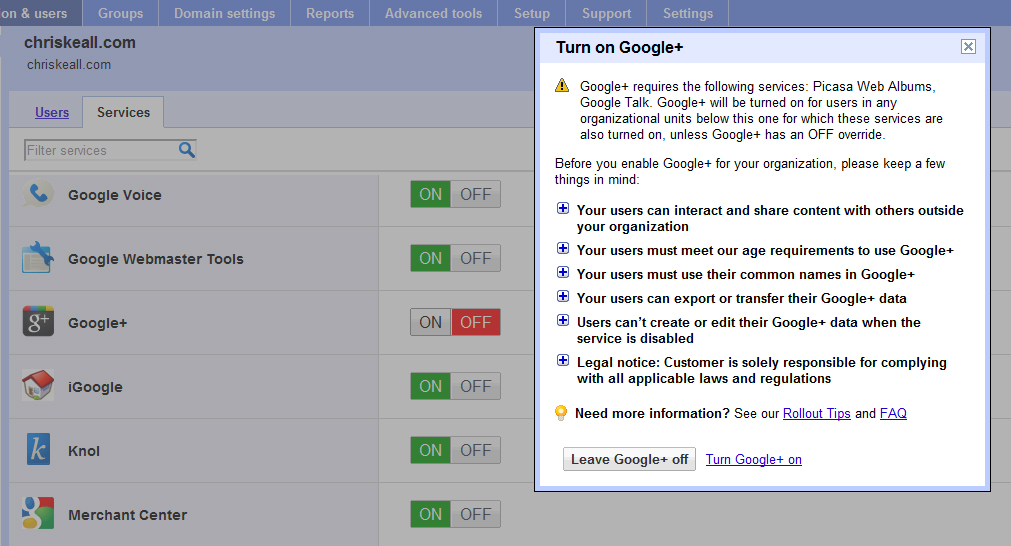 Your correspondent - Super Administrator of his one-man domain - immediately took advantage of the new option to turn on Google+.