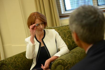 ABOVE: Julia Gillard tries out Google Glass during a February meeting with Google CFO Patrick Pichette.