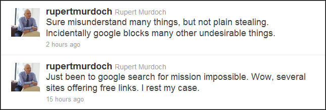 Tues Jan 16: Google has responded to News Corp chairman (and Twitter debutante) Rupert Murdoch's accusation that the search engine facilitates piracy (see Mr Murdoch's tweets below).