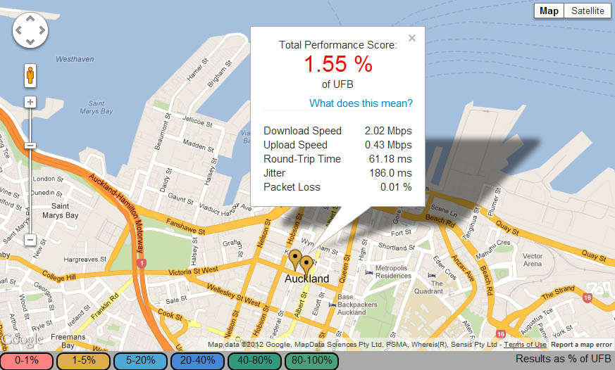 The result was expressed both in terms of a percentage of speed that could be achieved under the UFB Crown-subsidised fibre rollout – comparison that some may see as having political overtones, or at least an agenda to stoke demand for fibre – and in the more techy terms of megabits per second up and down: