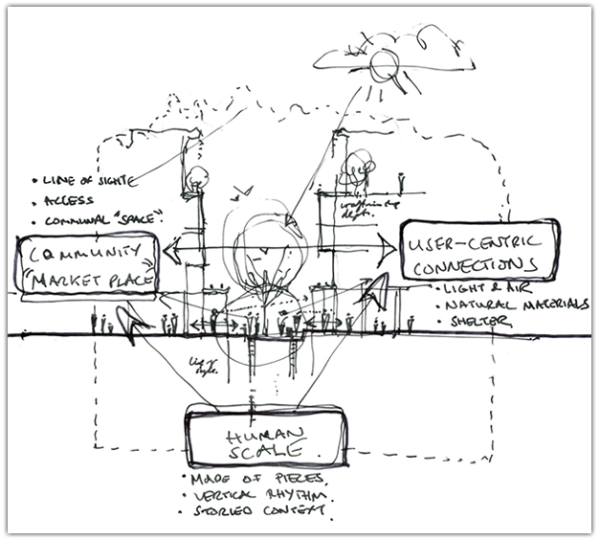 First, there must be an appropriate connection to the natural environment. Secondly, we must create an accessible "marketplace" for human interaction. Thirdly, the streets and buildings that form street activation must prioritise the use of human scale.
