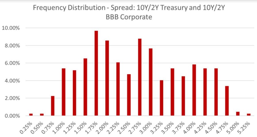 The Y axis provides the percentage of time the X axis values have occurred. The X axis represents the BBB 10-year CB premium over the US two-year TB yield.