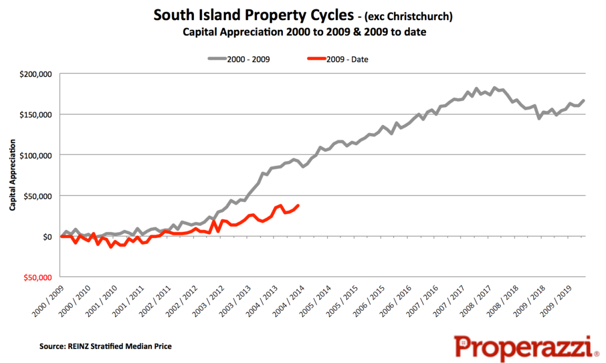 Excluding Christchurch from the South Island still leaves a reasonable property market with Otago as well as the Nelson / Marlbourgh region, the balance of the vast Canterbury region and of course Central Otago comprising that unique market of Queenstown. This aggregation of provincial South Island has benefited somewhat better in the past four and a half years than their North Island counterparts recording a capital appreciation of the median sales price of $37,426; after the same period at the start of the last decade it was $92,550. Clearly this region enjoyed a strong bull market in the past bull run, this time however the markets seem more subdued.